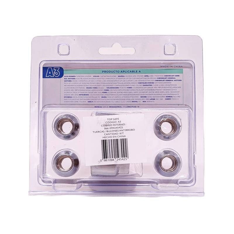 A3 BULON TUERCA ANTIRROBO ROSCA 12X1.5, HEXAGONO 19MM, LARGO 18MM. MARCAS: ALFA ROMEO / VOLVO / MAZDA / OPEL / CHEVROLET-GENERAL MOTORS / CHRYSLER-DODGE / DAIHA