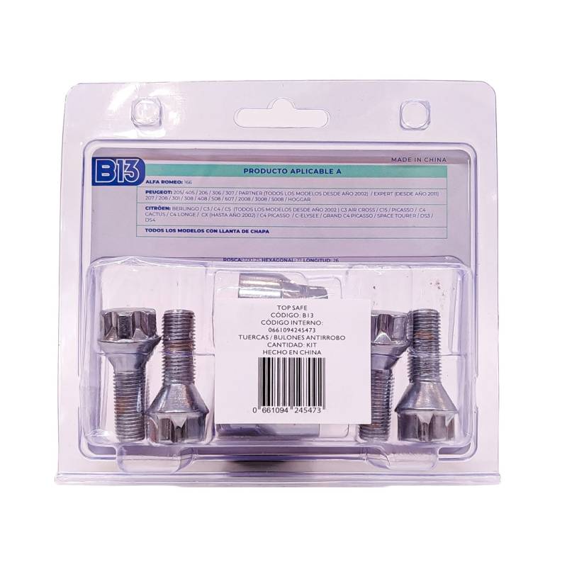 B13 BULON ANTIRROBO ROSCA 12X1.25, HEXAGONO 17MM, LARGO 26MM. MARCAS: ALFA ROMEO / PEUGEOT / CITROEN