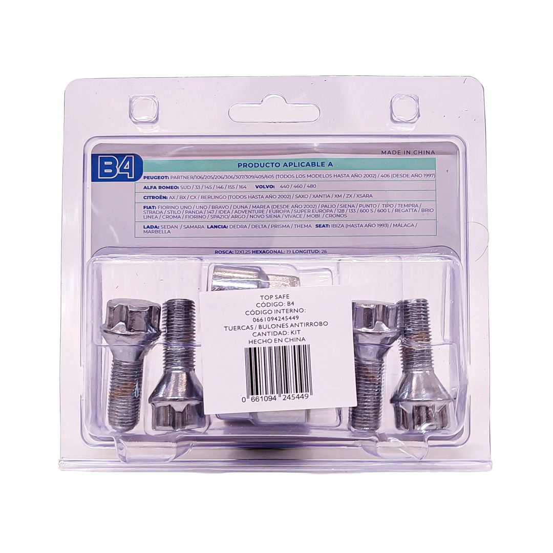 B4 BULON ANTIRROBO ROSCA 12X1.25, HEXAGONO 19MM, LARGO 26MM. MARCAS: PEUGEOT / CITROËN / FIAT / SEAT