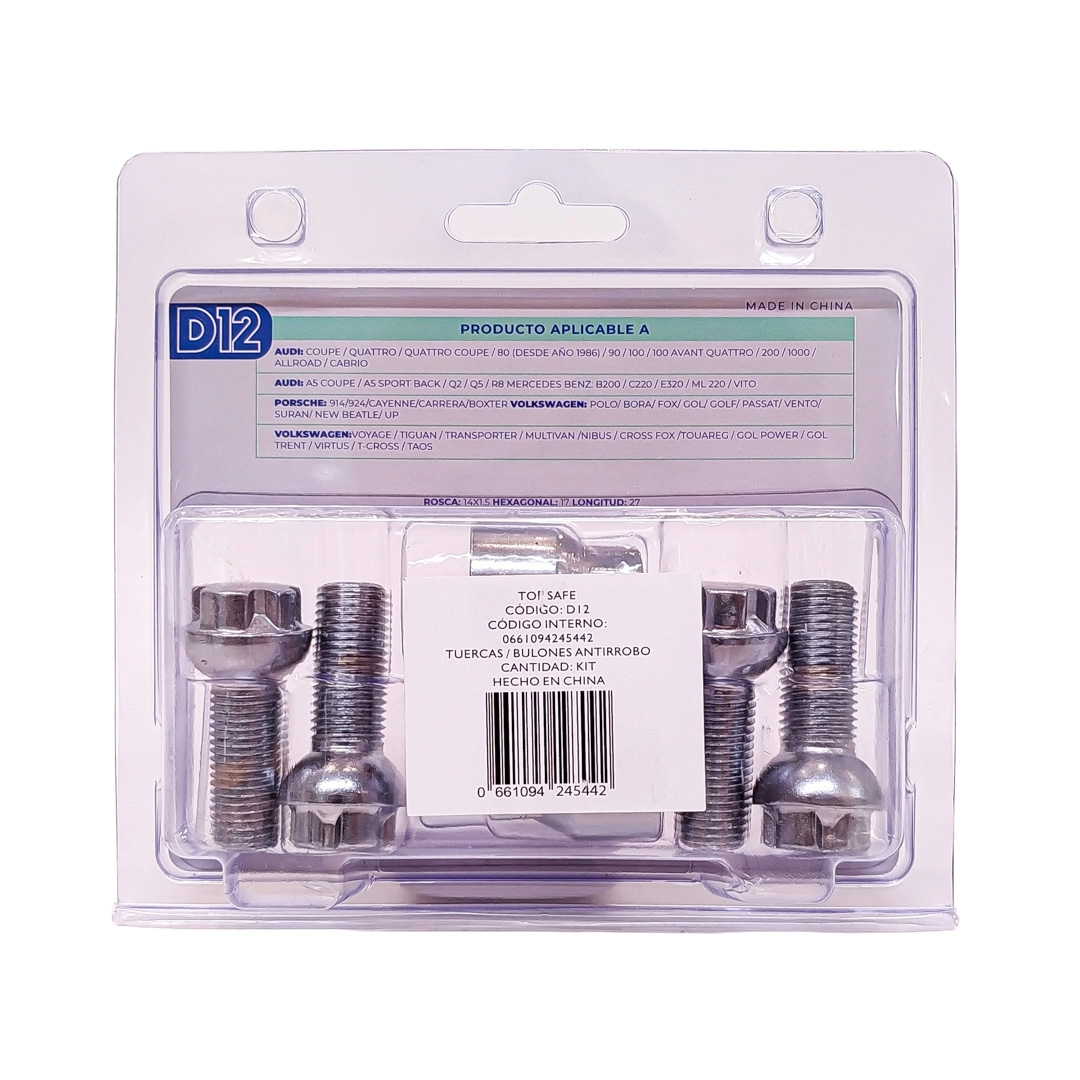 D12 BULON ANTIRROBO ROSCA 14X1.5, HEXAGONO 17MM, LARGO 27MM. MARCAS: AUDI / MERCEDES BENZ / PORSCHE / VOLKSWAGEN