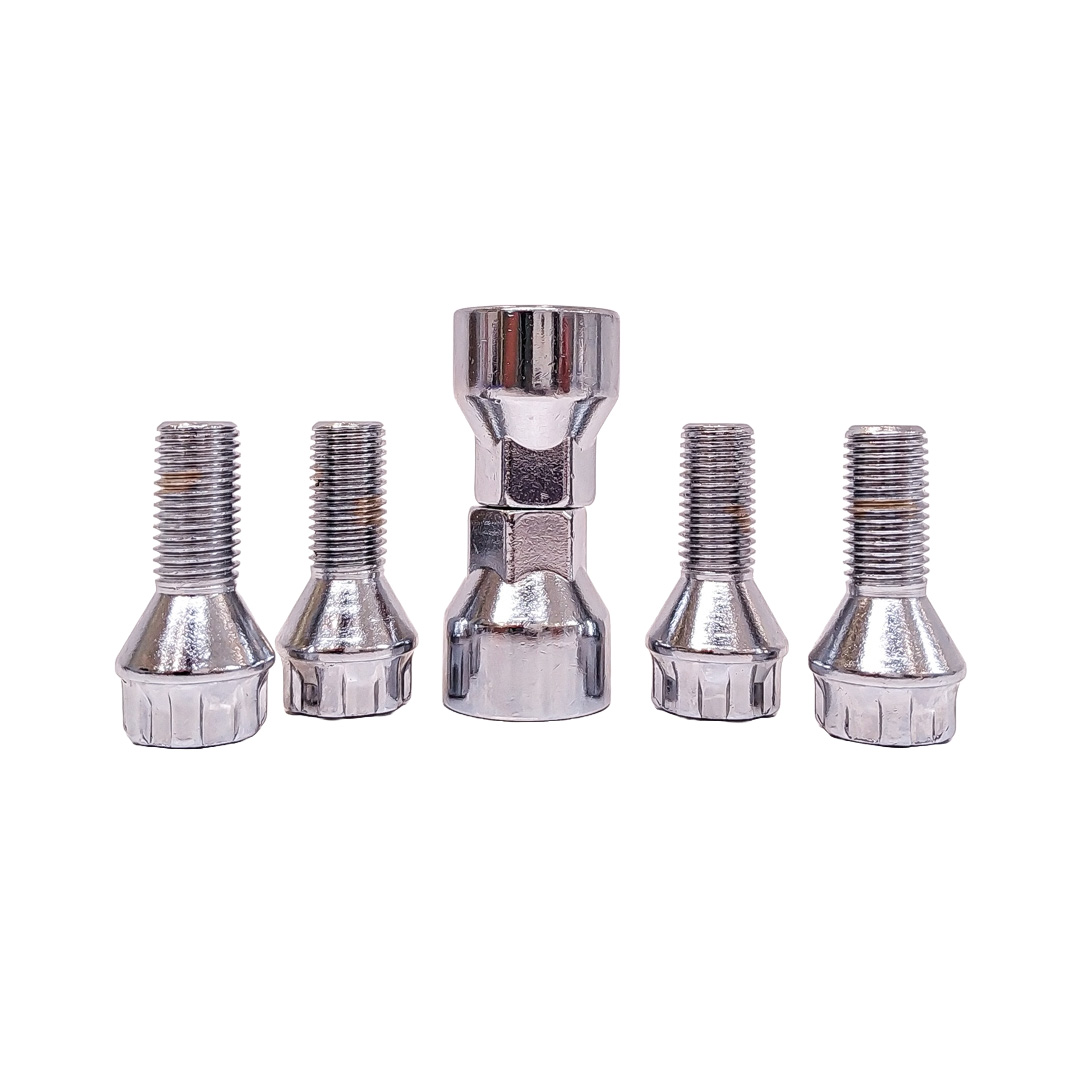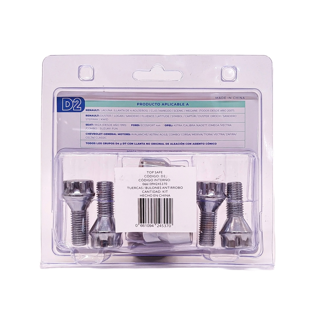 CONJUNTO DE 4 BULONES + 2 LLAVES MEDIDAS PASO DE ROSCA 12X1.5, HEXAGONO 17MM, LARGO 24MM. MARCAS: RENAULT / SEAT / FORD / OPEL / CHEVROLET-GENERAL MOTORS / SUZUKY