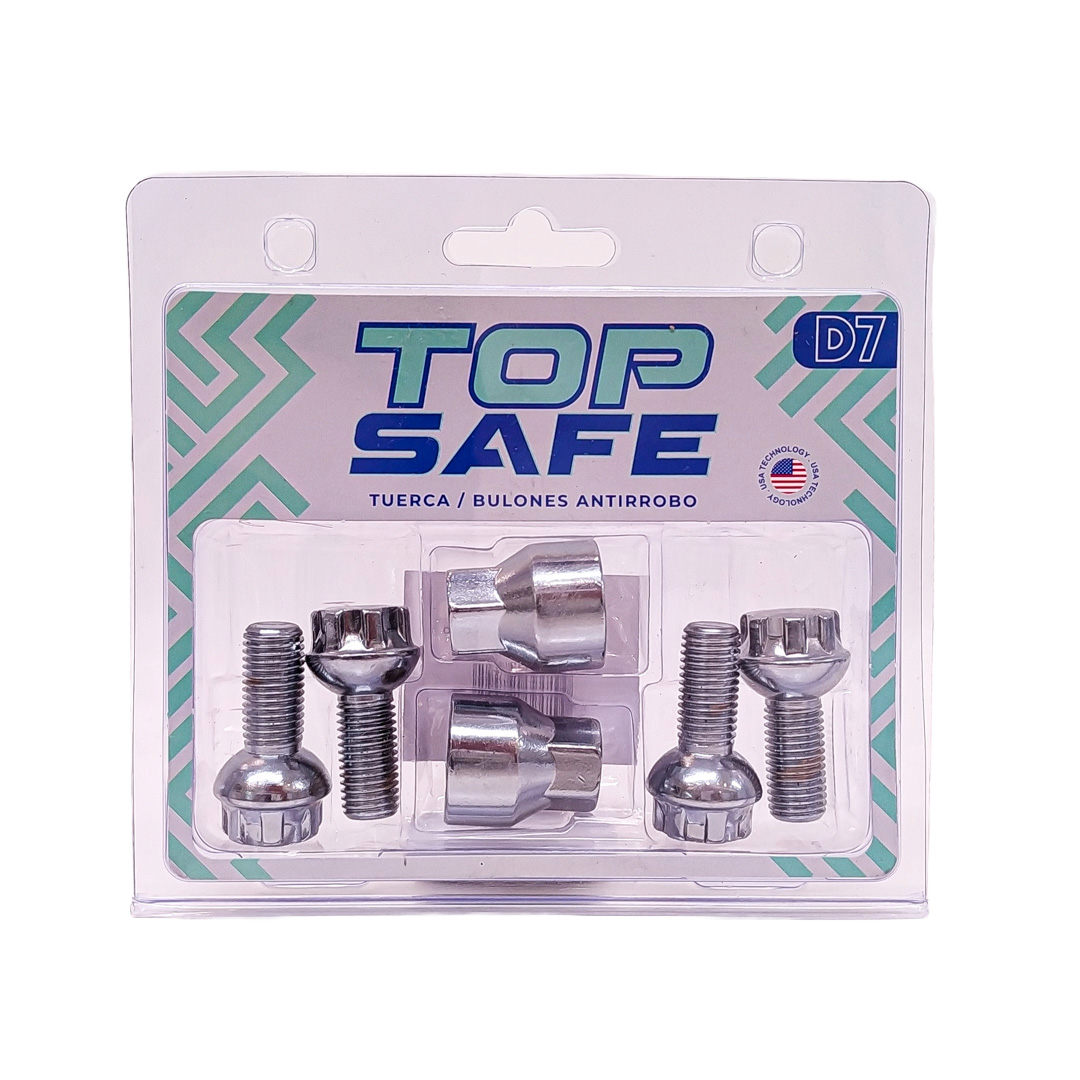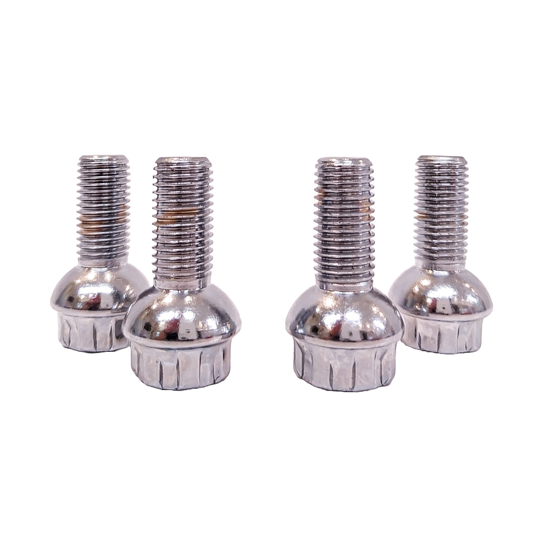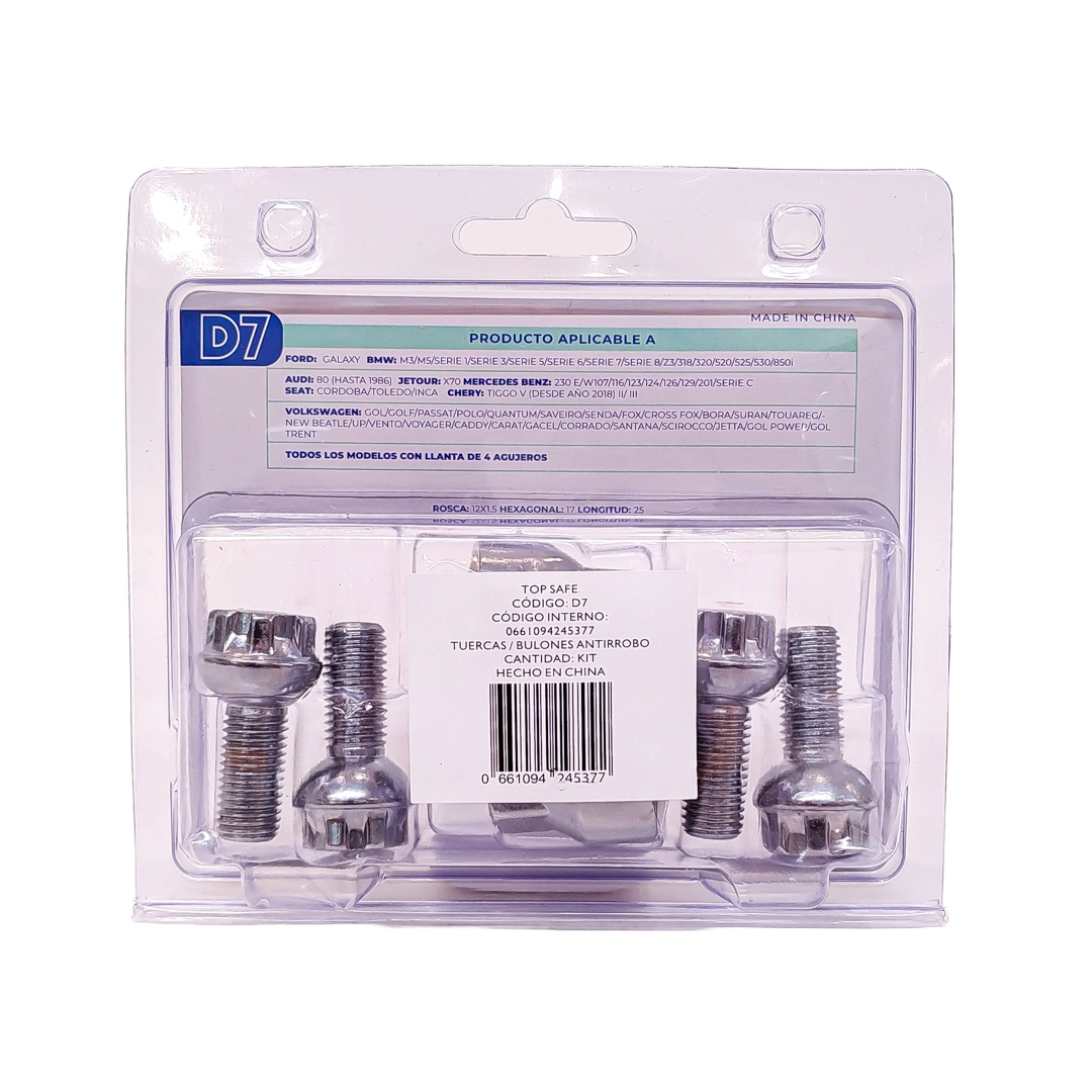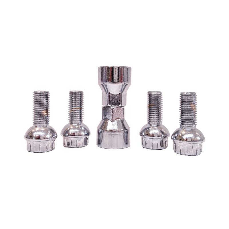 CONJUNTO DE 4 BULONES + 2 LLAVES MEDIDAS PASO DE ROSCA 12X1.5, HEXAGONO 17MM, LARGO 25MM. MARCAS: FORD / BMW / JETOUR / MERCEDES BENZ / VOLKSWAGEN / SEAT / CHERY