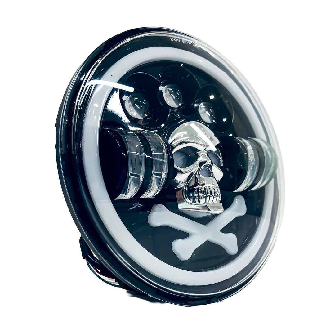 REDONDO 7 CALABERA USO IDEAL JEEP WRANGLER - RENEGADE / MOTO HARLEY DAVIDSON - ROYAL ENFIELD CON FUNCION ALTA Y BAJA + DRL BLANCO Y AMBAR- HAZ DE LUZ SPOT - 40 WATTS 12V A 36V
