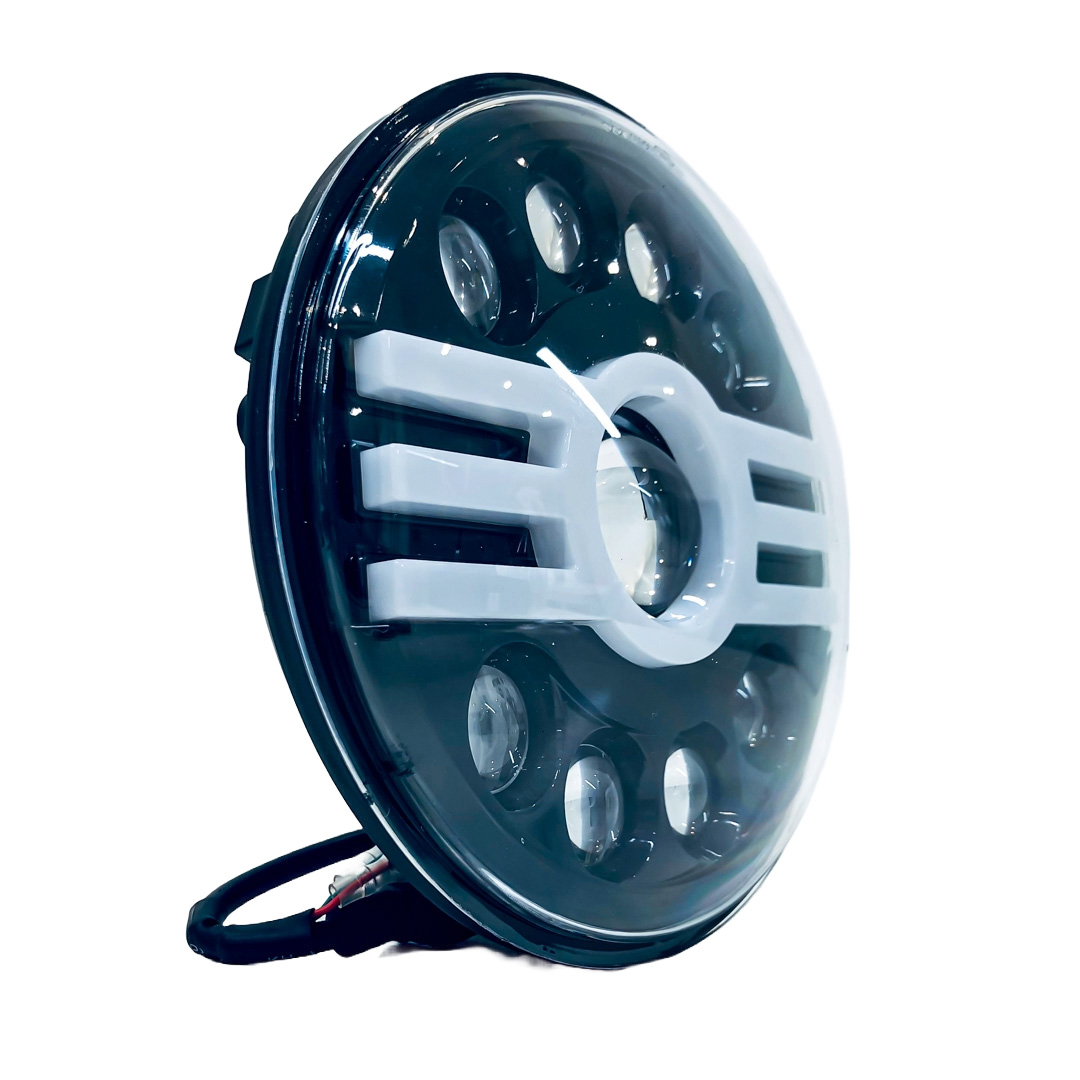 REDONDO 7 USO IDEAL JEEP WRANGLER - RENEGADE / MOTO HARLEY DAVIDSON - ROYAL ENFIELD CON FUNCION ALTA Y BAJA + DRL BLANCO Y AMBAR Y AMBAR- HAZ DE LUZ SPOT - 40 WATTS 12V A 36V