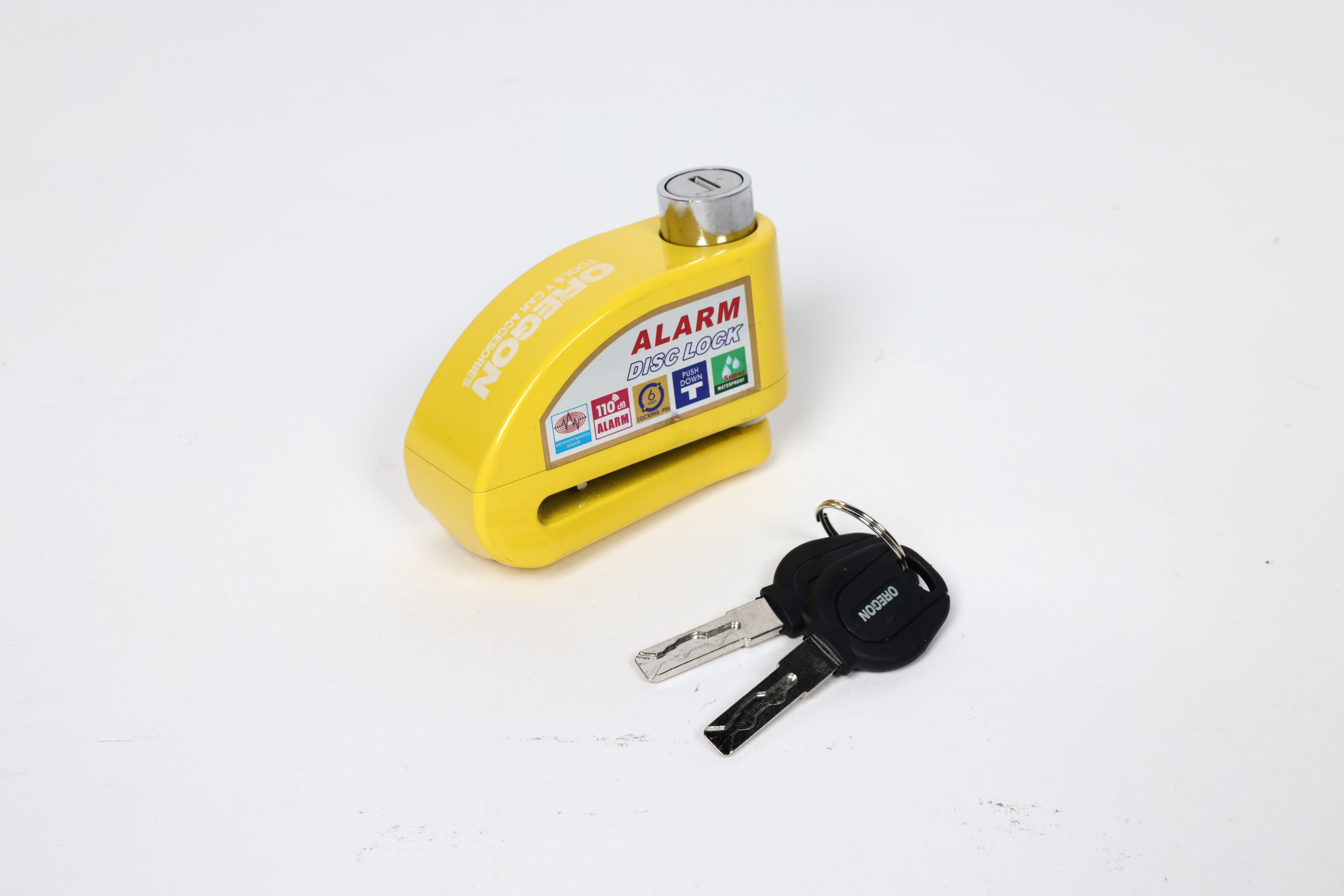 CANDADO BLINDADO CON ALARMA COLOR AMARILLO PARA DISCO DE MOTO / BICI Y DOS LLAVES
