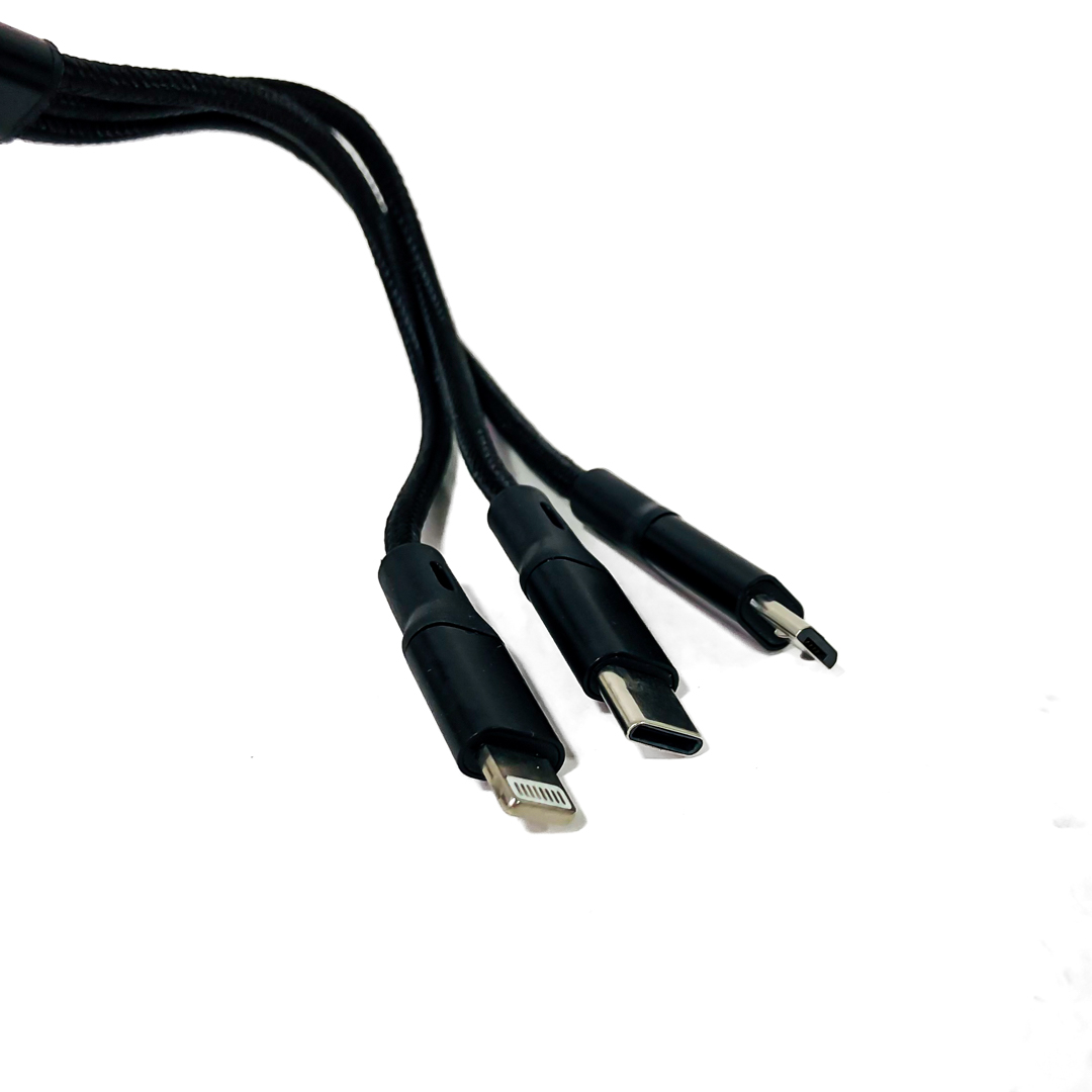 CABLE CARGADOR 3 EN 1 DE 1.20 METROS: USB A MICRO USB, LIGHTING, TIPO C, COLOR NEGRO