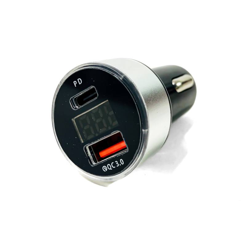 CARGADOR USB + TIPO C 12V / 24V 20 WATTS + VOLTIMETRO COLOR NEGRO CON ARO PLATEADO.