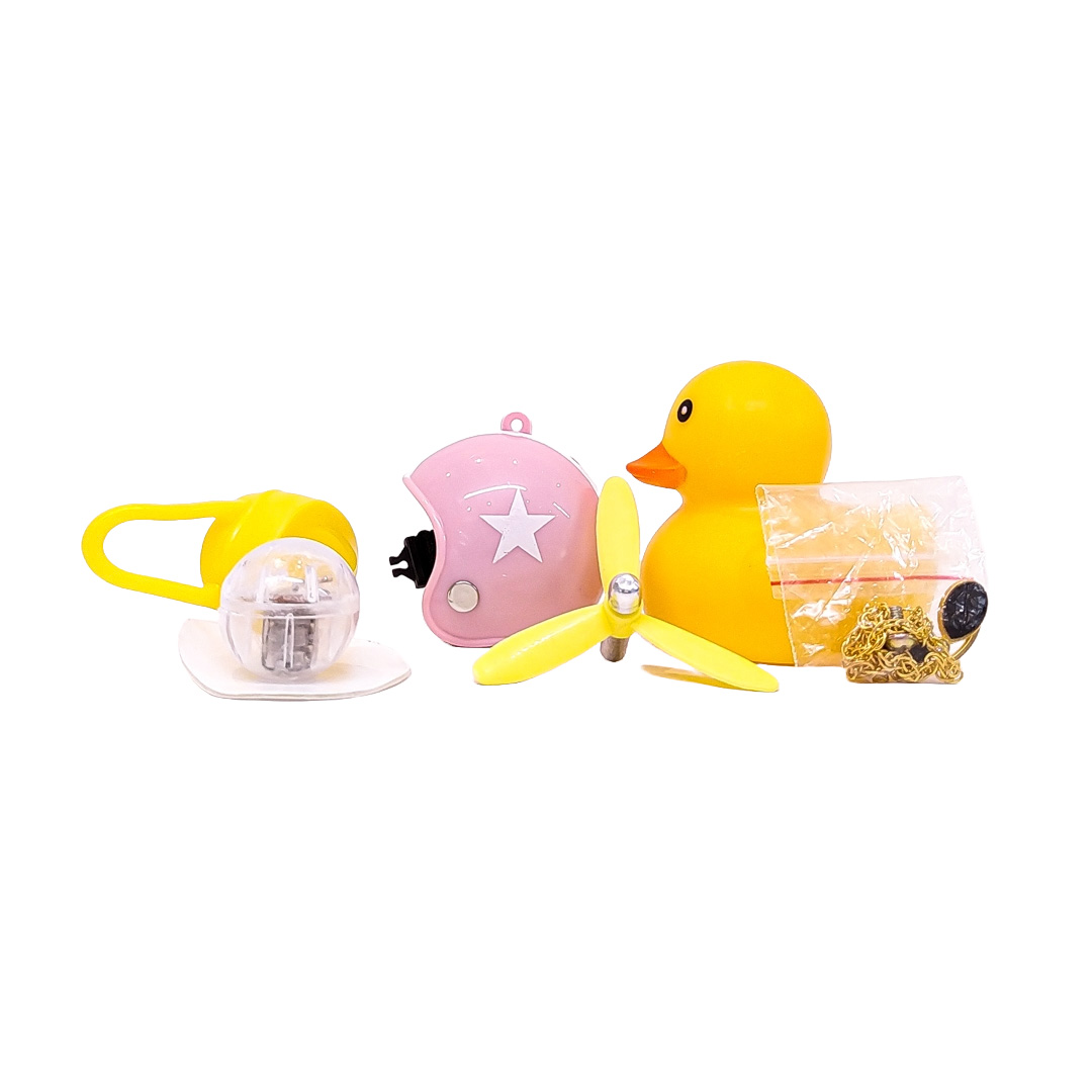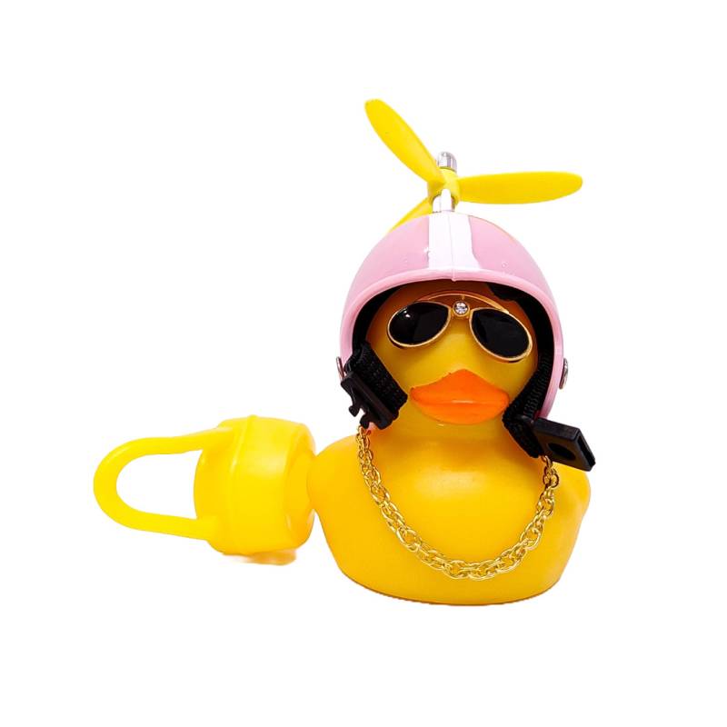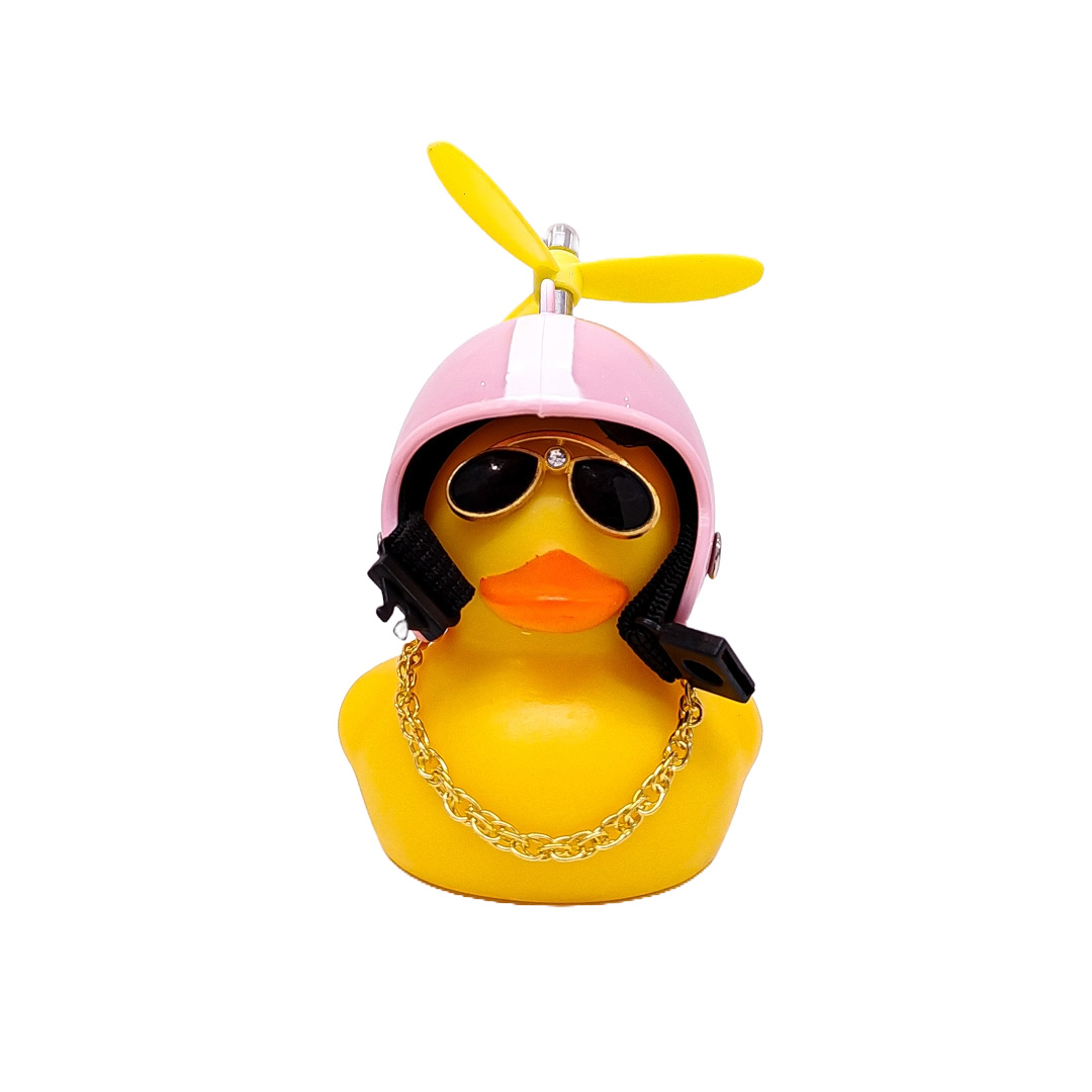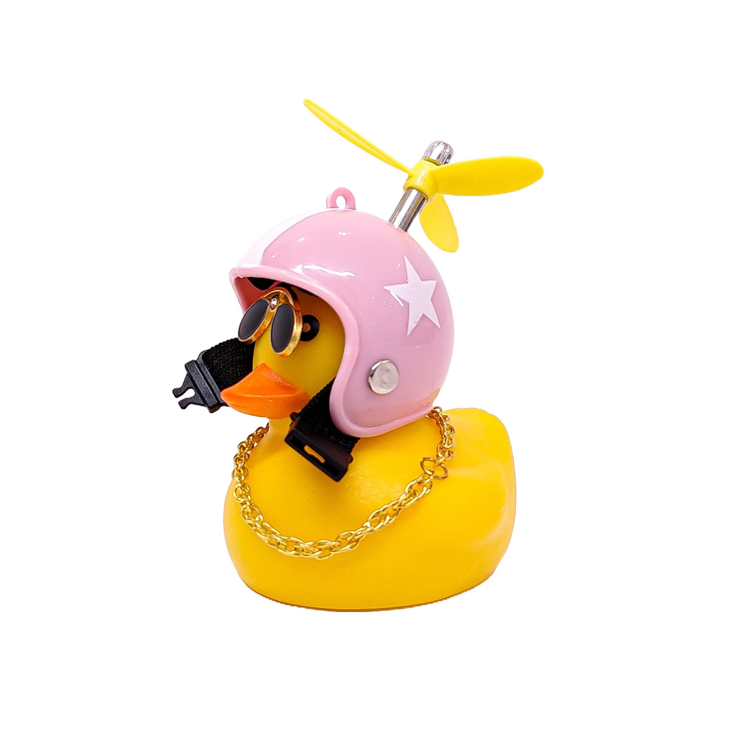OR-DUCK006 PATITO DECORATIVO PARA AUTO, BICI O MOTO CASCO ROSA DIBUJO RACING CON ANTEOJOS, CADENA Y HELICE