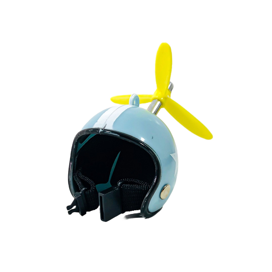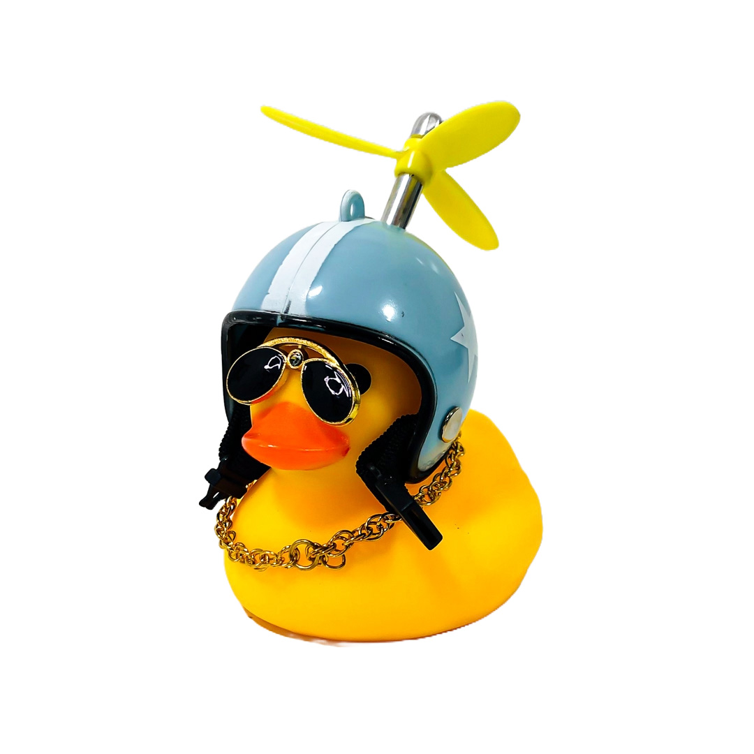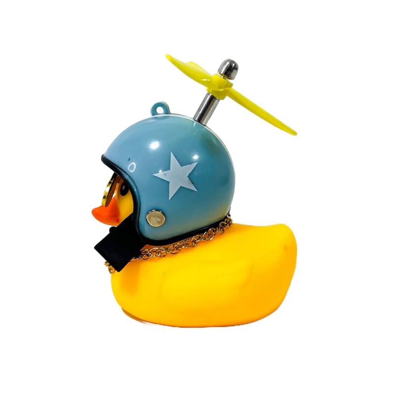 OR-DUCK009 PATITO DECORATIVO PARA AUTO, BICI O MOTO CASCO CELESTE DIBUJO ESTRELLA CON ANTEOJOS, CADENA Y HELICE