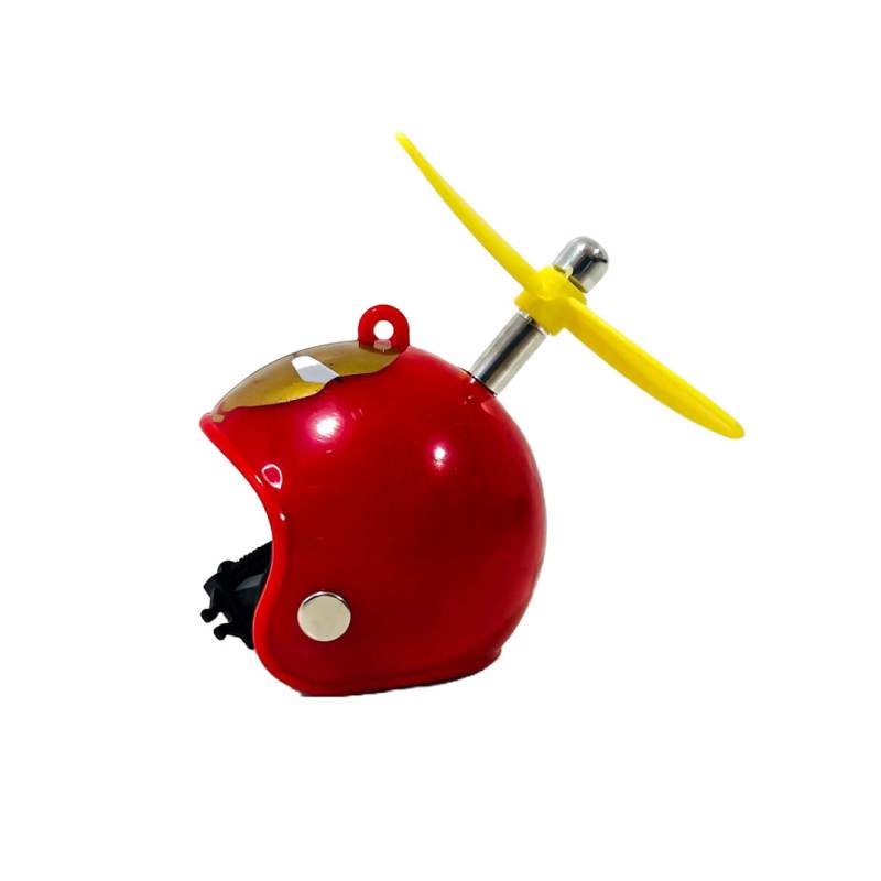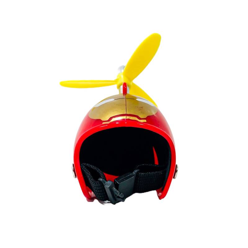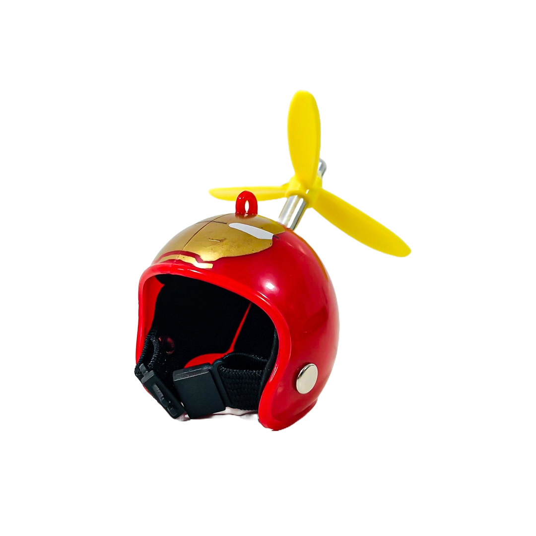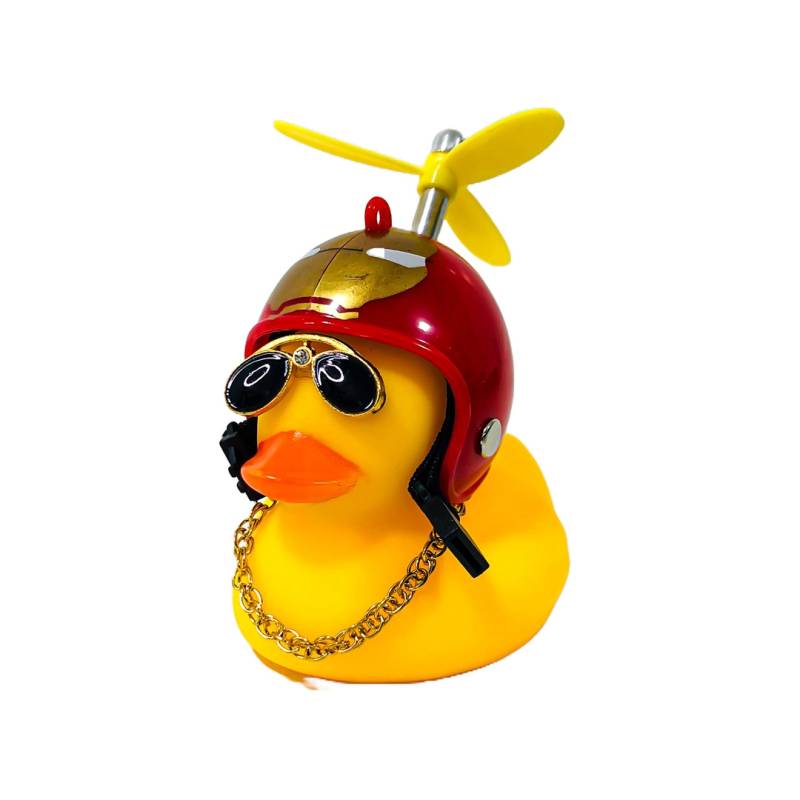 OR-DUCK011 PATITO DECORATIVO PARA AUTO, BICI O MOTO CASCO ROJO DIBUJO IRON MAN CON ANTEOJOS, CADENA Y HELICE