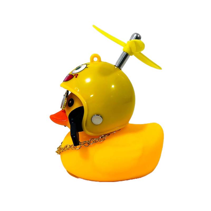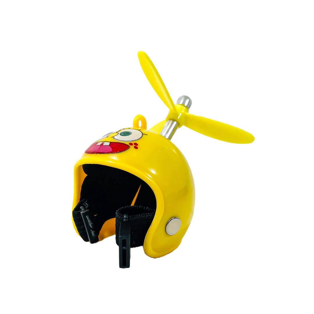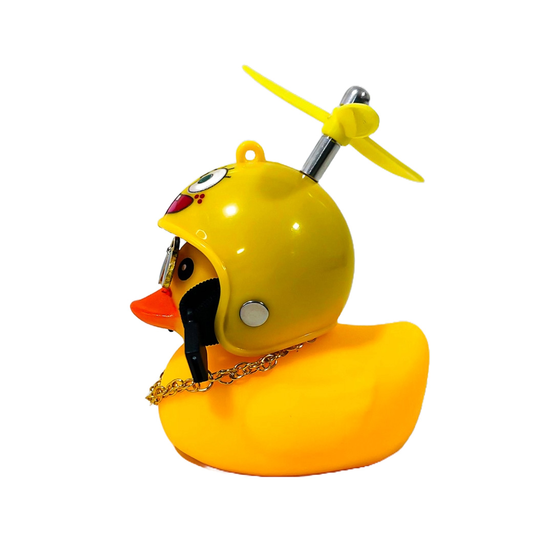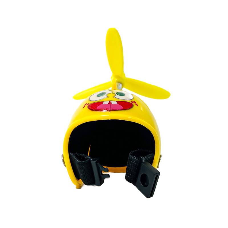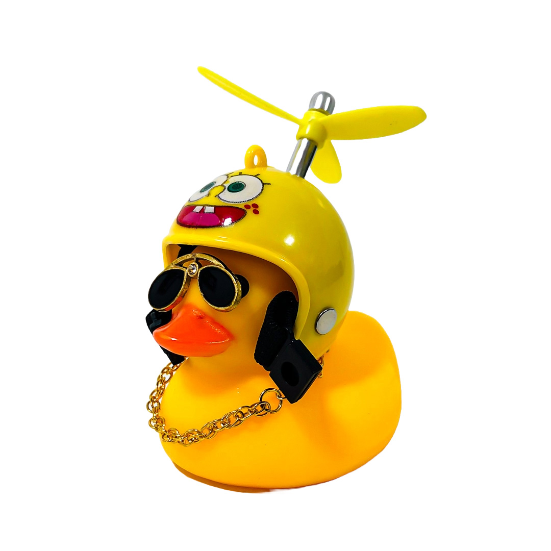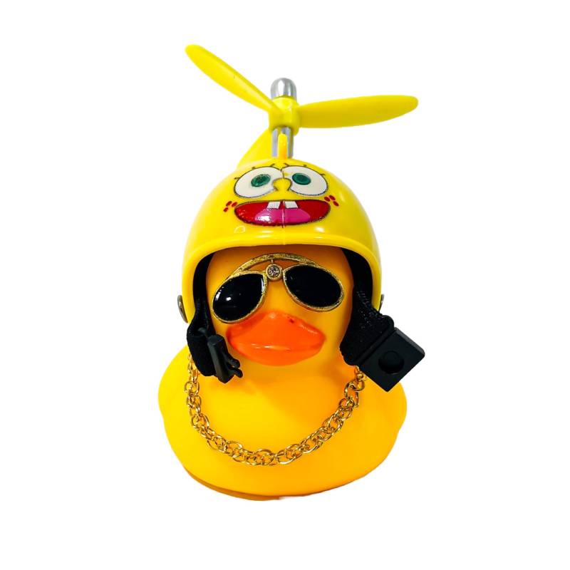 OR-DUCK013 PATITO DECORATIVO PARA AUTO, BICI O MOTO CASCO AMARILLO DIBUJO BOB ESPONJA CON ANTEOJOS, CADENA Y HELICE