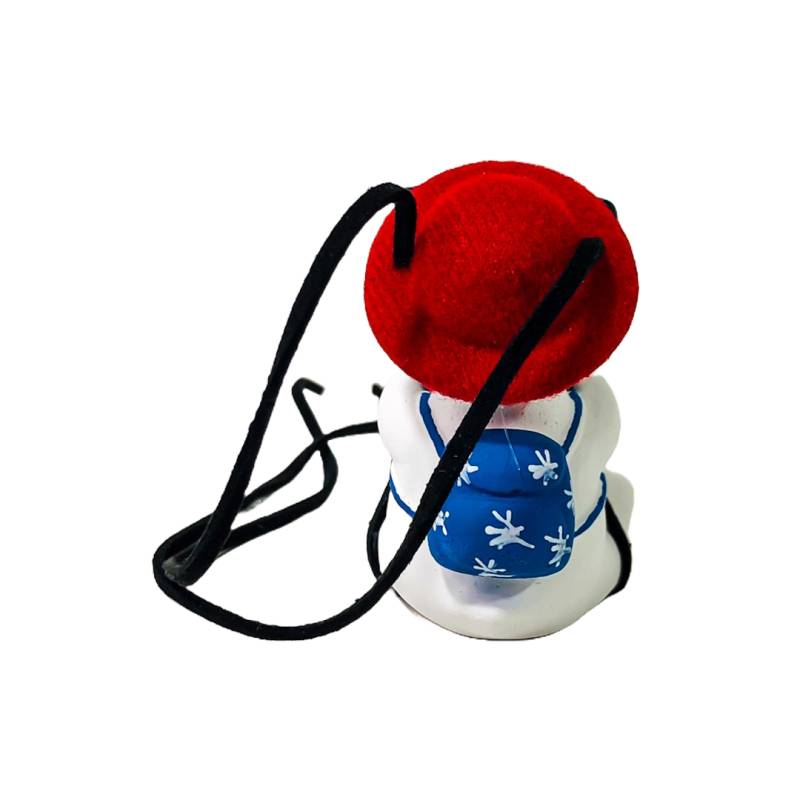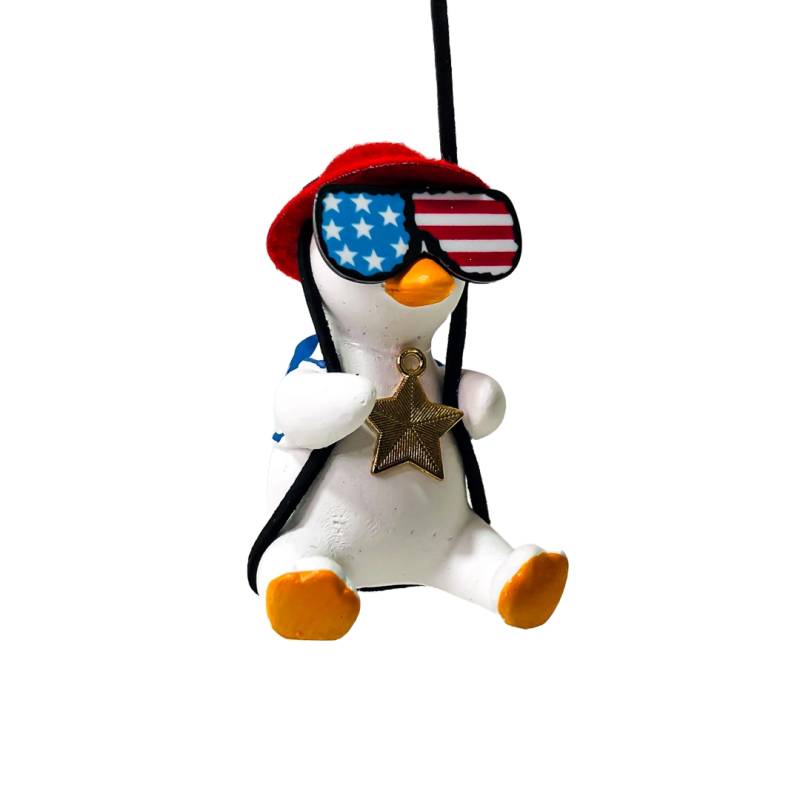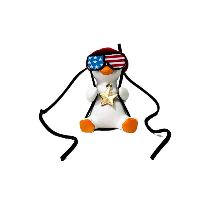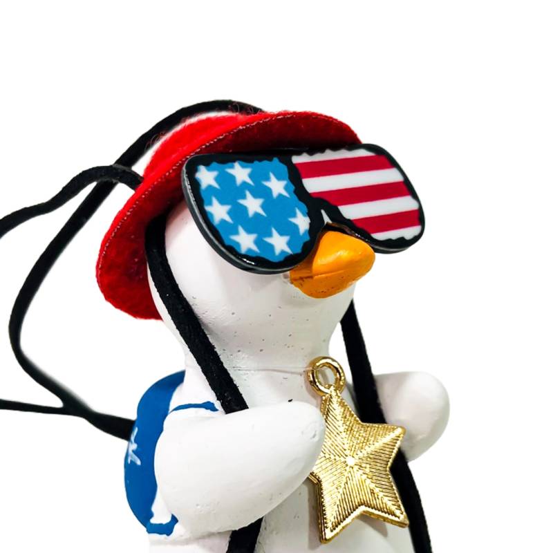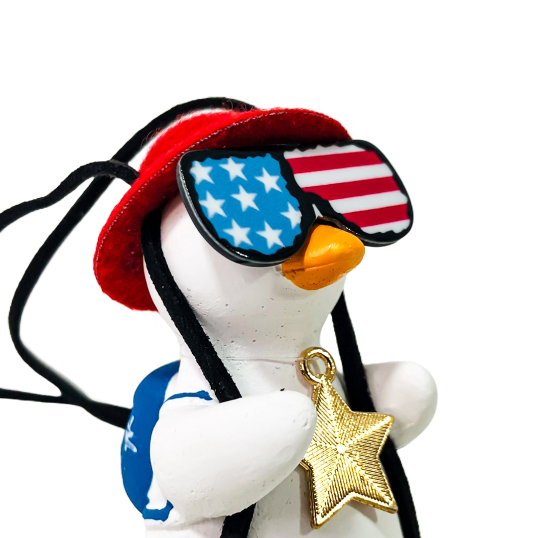 OR-DUCK016 PATITO DECORATIVO COLGANTE DE CERAMICA PARA AUTO AMERICAN DREAM CON GAFAS, MOCHILA Y COLLAR TIPO USA